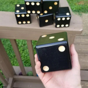 - PREMIUM GIANT WOODEN DICE - Each Grown Man Games Wooden Dice measures 3.5" x 3.5" and features a black, weather resistant lacquer coating for outdoor or indoor games. Ideal for happy hour, pre-gaming, house parties, reunions, family events, and more! Each Grown Man Games Giant Wooden Dice Set is meticulously crafted and will provide years of entertainment and fun!