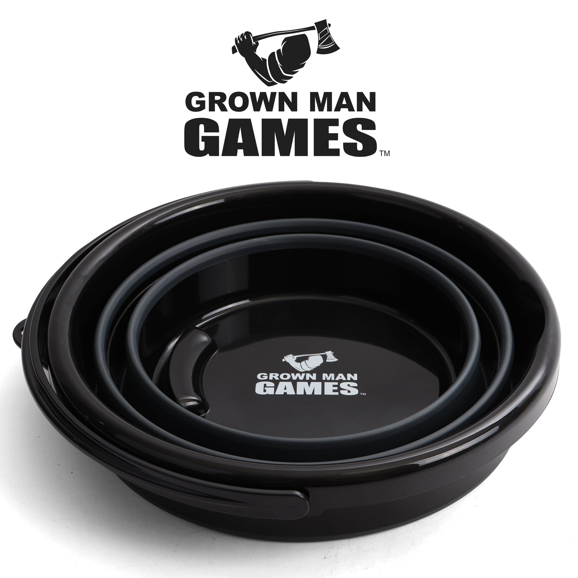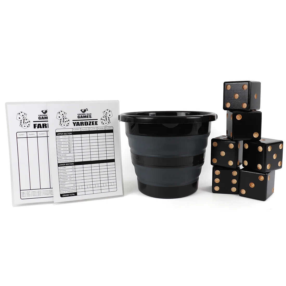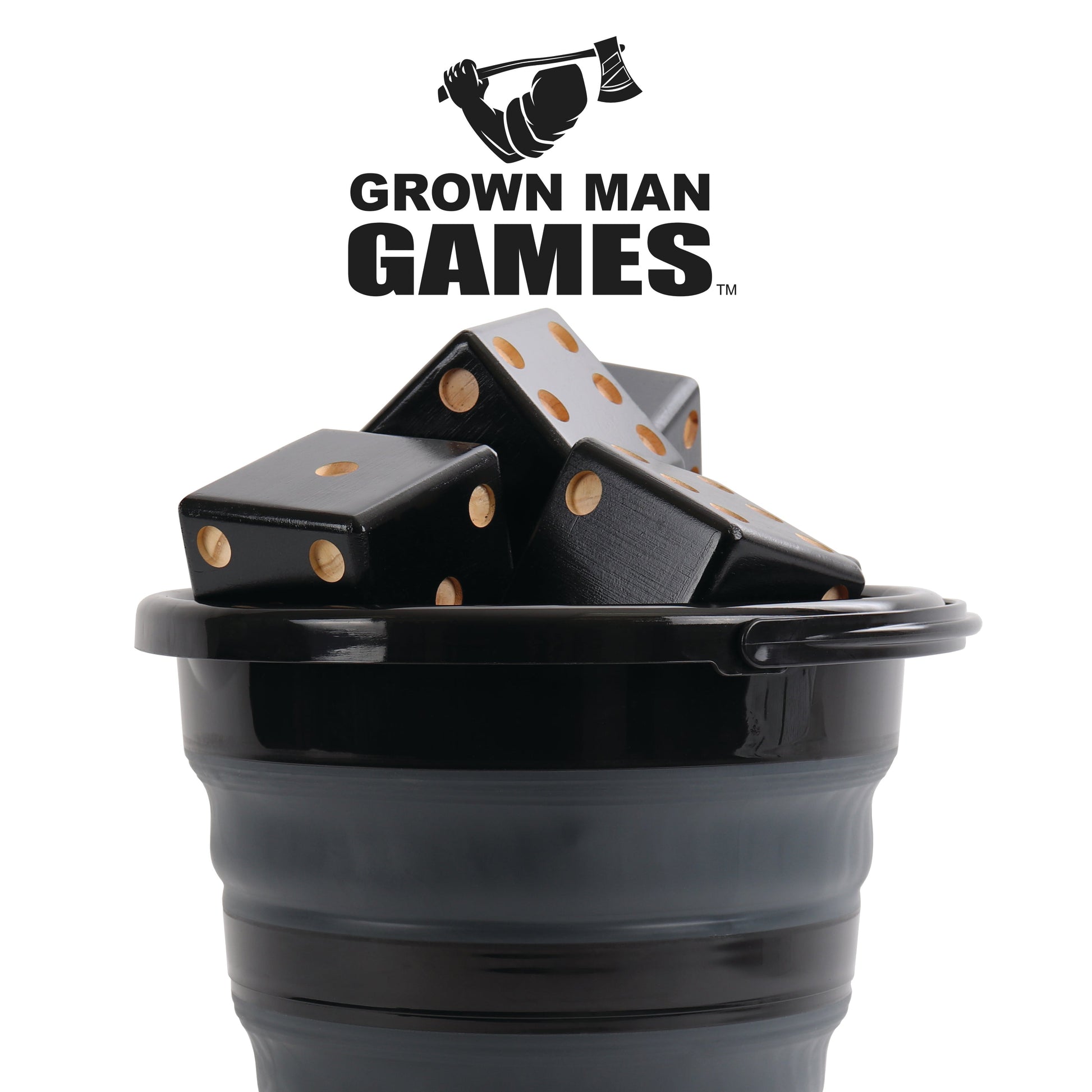 - EASY SET-UP - The Grown Man Games Yard Dice Set includes everything you need to start playing this fun, outdoor game. Each set comes with One collapsible bucket, 2 laminated Farkle and Yardzee score cards, one dry erase marker, and 6 giant wooden dice (3.5" x 3.5"). The convenient silicone and plastic bucket features a handle making everything from set-up to clean-up a breeze.