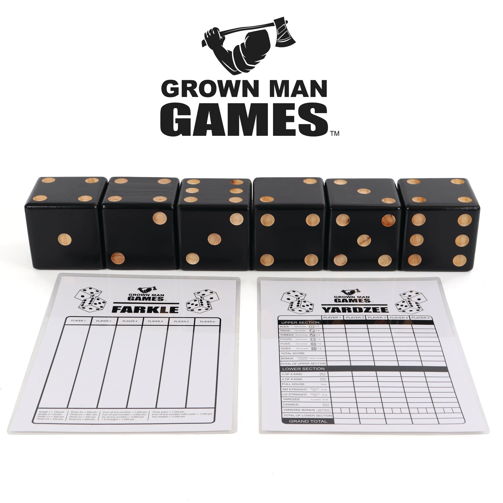 - GROWN MAN GAMES YARD DICE - The Grown Man Games Yard Dice Set is the perfect outdoor game for kids and adults of all ages. Giant Yardzee and Giant Farkle (Yard Farkle / Yardkle) will be a hit at backyard barbecues, vacations, family reunions, outdoor events, weddings, and more. Giant Dice are a great alternative to traditional outdoor games, tailgating games, and beach games such as corn hole, molkky, can jam, bucketball, kubb, boccee ball, and spikeball.