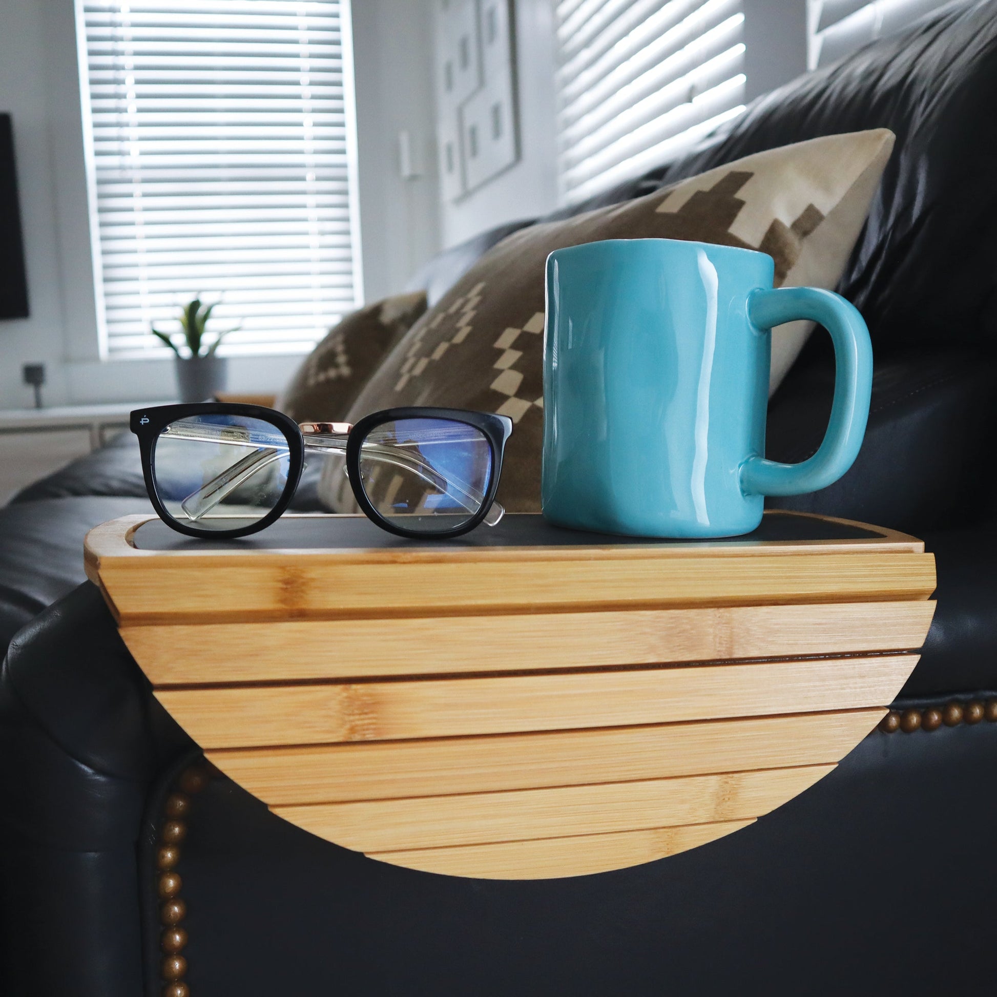 - BELARI BAMBOO SOFA ARM TABLE - The simplistic yet versatile design of the Belari sofa arm table combines modern and minimalist styling to create a functional space for couch arms. Each Belari couch tray can be used in a variety of ways, as a couch cup holder, a place to rest your book and reading glasses, or a resting place for the remote control.Â