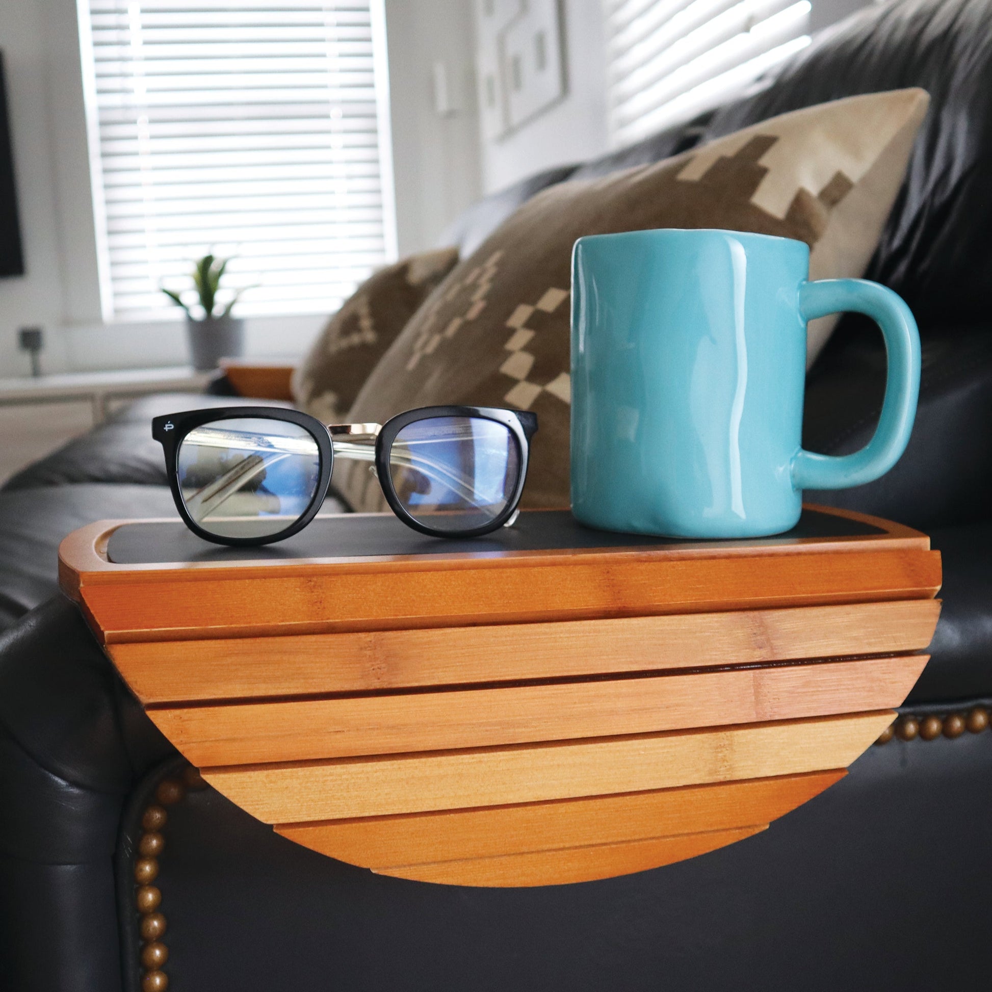 - FLEXIBLE DESIGN - The natural bamboo creates a stylish and functional space on virtually any couch arm. The flexible bamboo slats are designed to fit square or rounded armrests bigger than 4.75". The flexible and foldable design can also be placed flat on couch cushions and used as a tv tray.