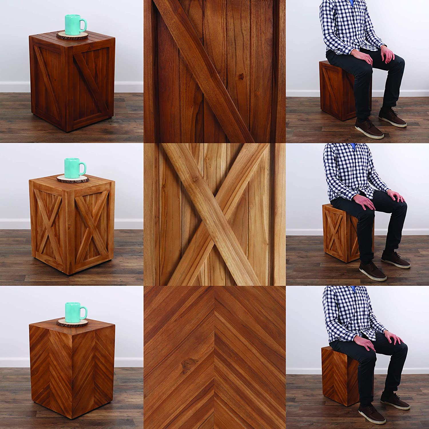- MULTI-USE - Belari Teak Garden Stools can be used in all kinds of ways! Use them as a farmhouse end table inside, a patio side table outside, a rustic dining stool in the kitchen, a farmhouse side table in the living room, an indoor or outdoor side table, or an indoor or outdoor stool! With the combination of both rustic and modern barn door styling, you can add farmhouse charm to any area of the house, even the garden!Â